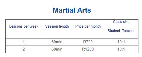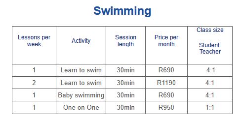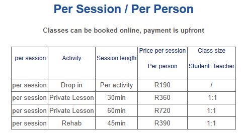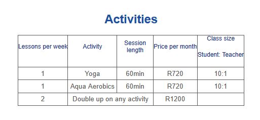 - Price for any 2 activities R1200 per month per person